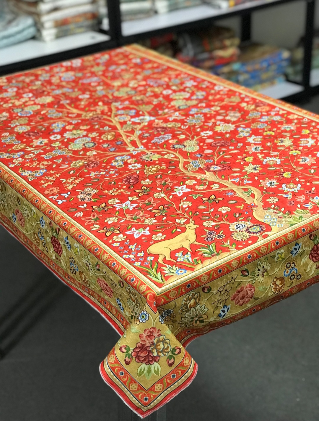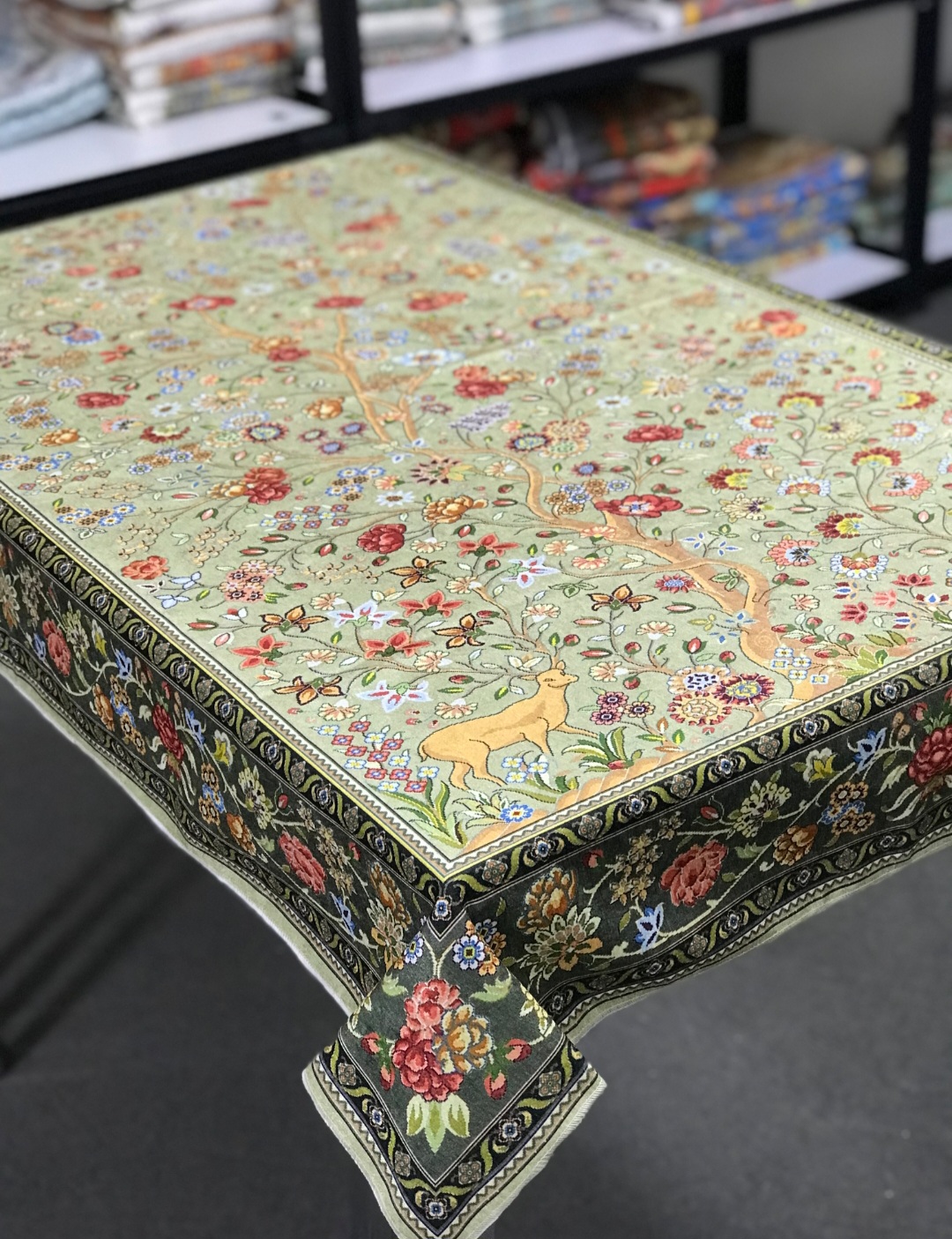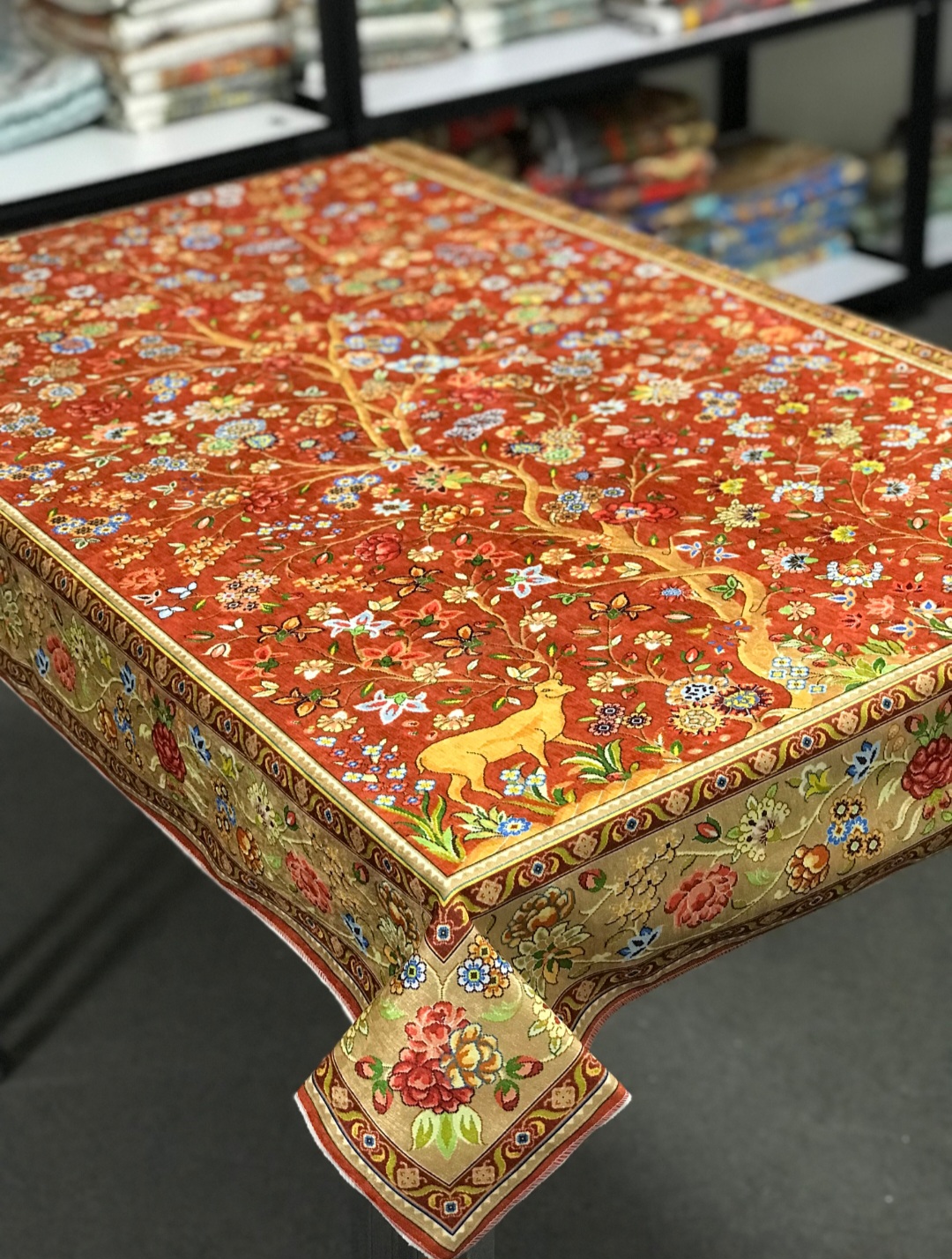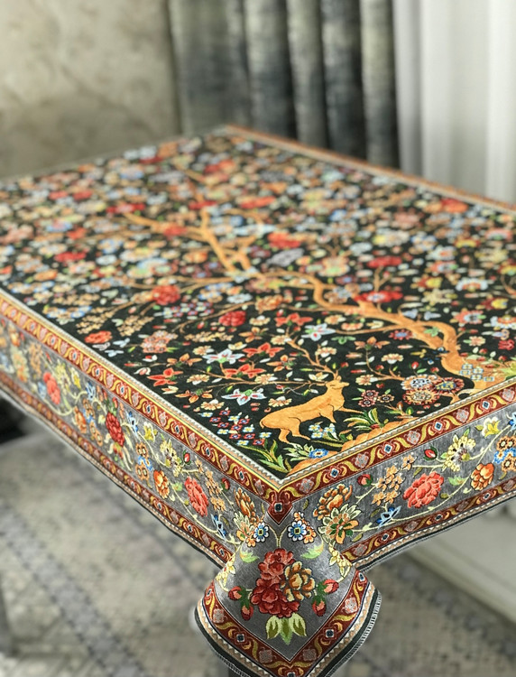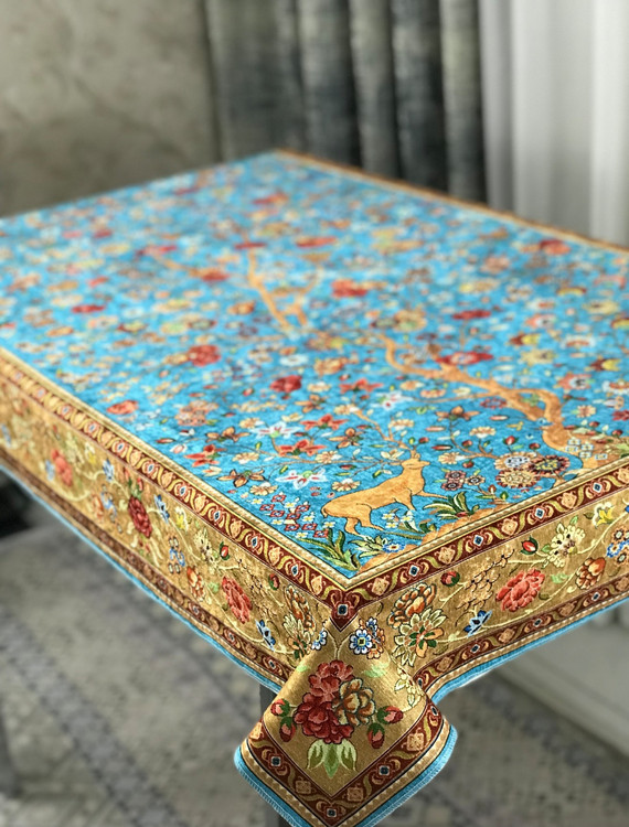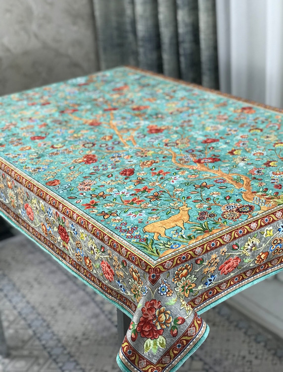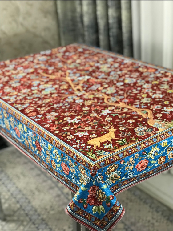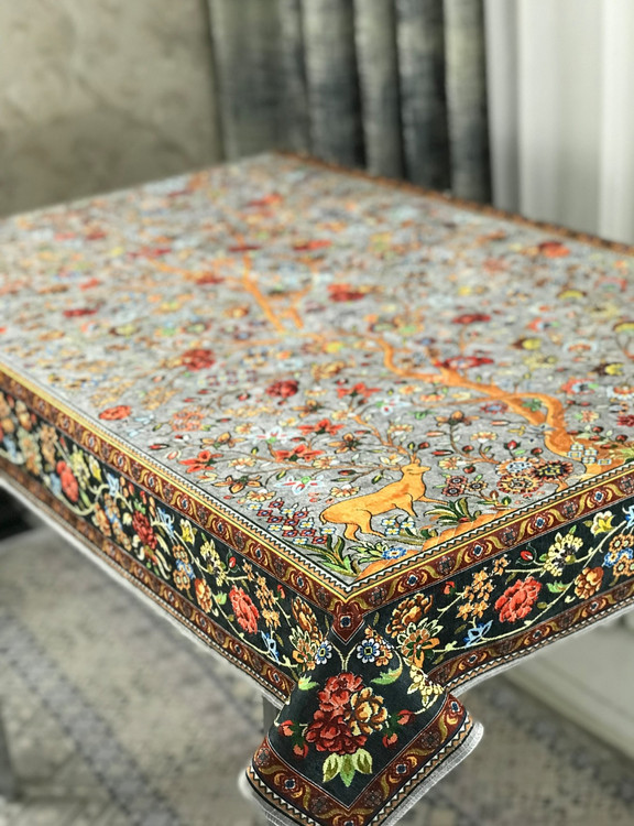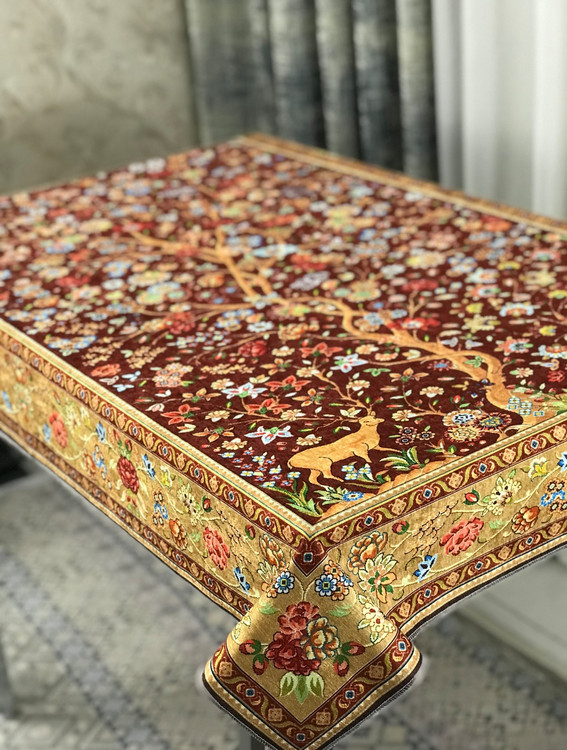 🧶 تجلی هنر و طبیعت بر روی میز شما؛ سفره طرح «آهو» با پارچه مخمل وارداتی و طرحهای اصیل، انتخابی ویژه برای خانمهای خوشسلیقه است.
